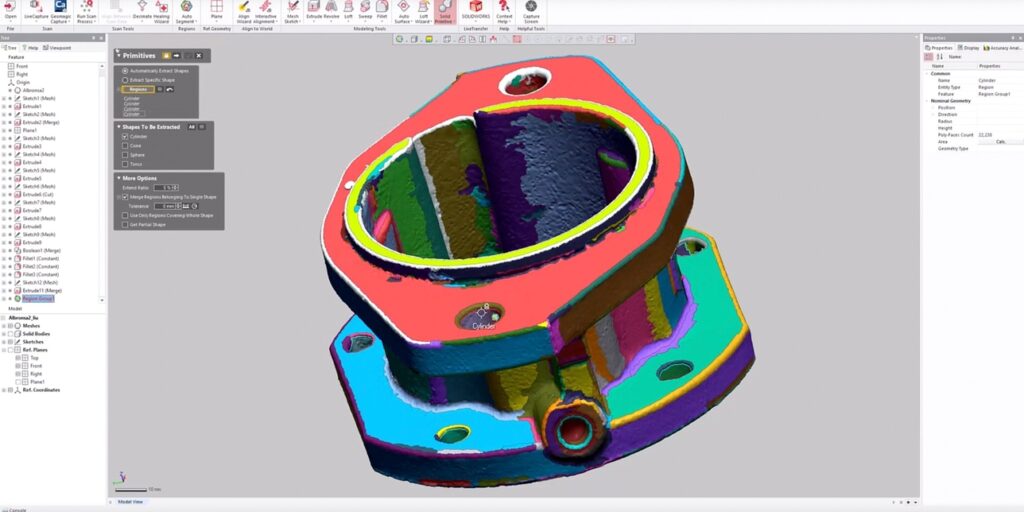 Posteriormente, se inicia la conversión de la malla a sólidos y superficies CAD. Geomagic Design X destaca porque permite construir el modelo siguiendo un historial de operaciones, similar a un software CAD tradicional.